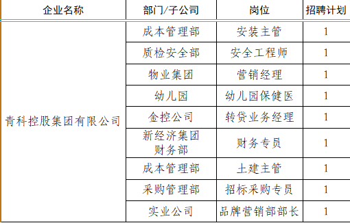 为满足集团业务发展需要,青科控股集团有限公司现面向社会公开招聘工作人员9名,具体招聘公告如下: